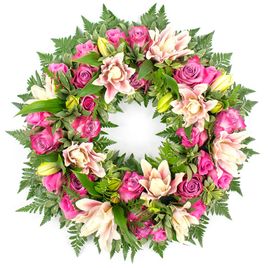 Pay your respects with our elegant memorial flower wreath, thoughtfully arranged with fresh roses and lilies. The unique combination of colors and textures creates a beautiful and lasting tribute.
